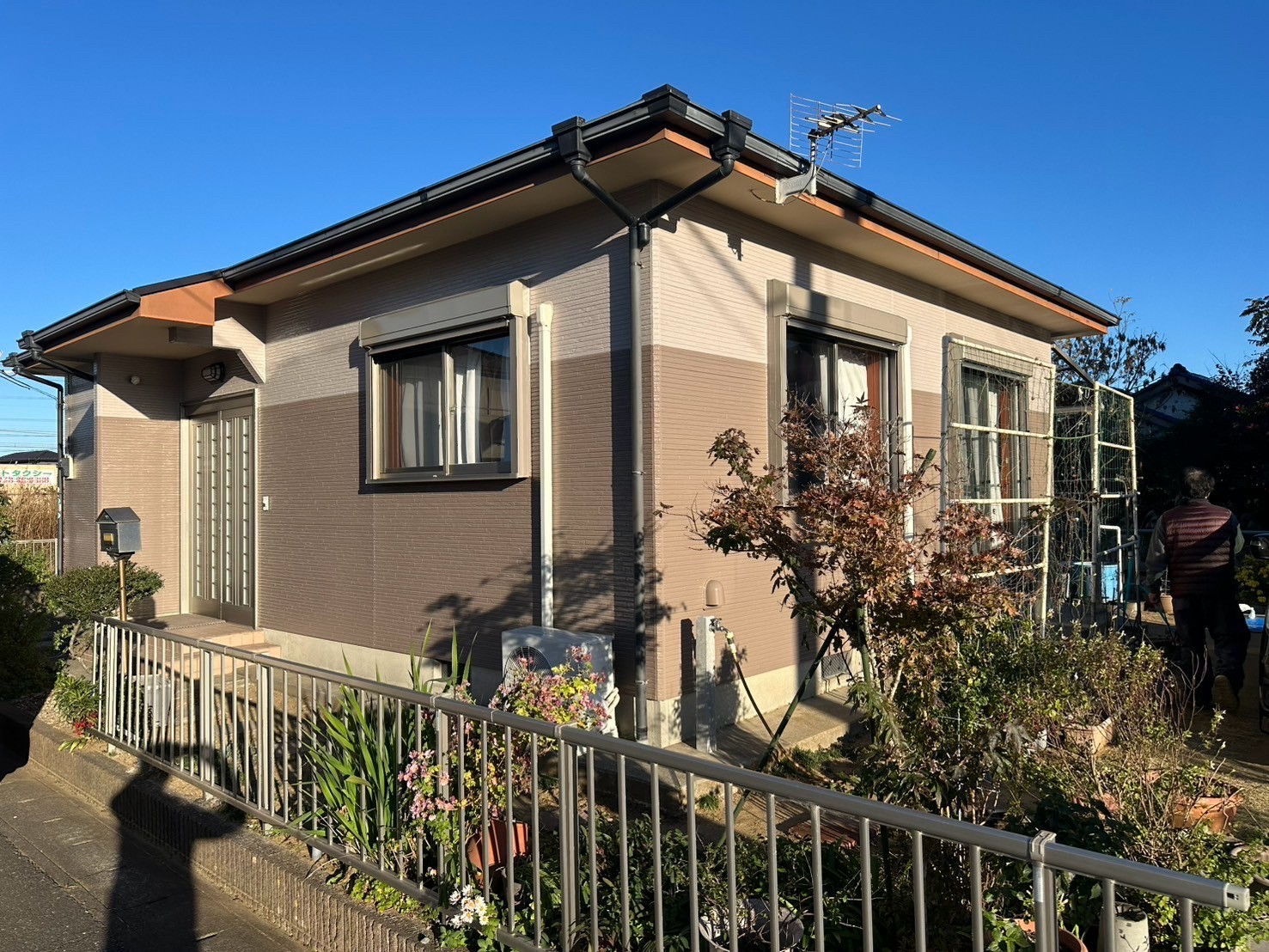 | 施工のポイント | 平屋で、もともと単色だった外壁を2色に塗り分けたいというご要望がありました。職人がミリ単位でラインを調整し、細部まで美観を意識した仕上がりを実現しました。 |