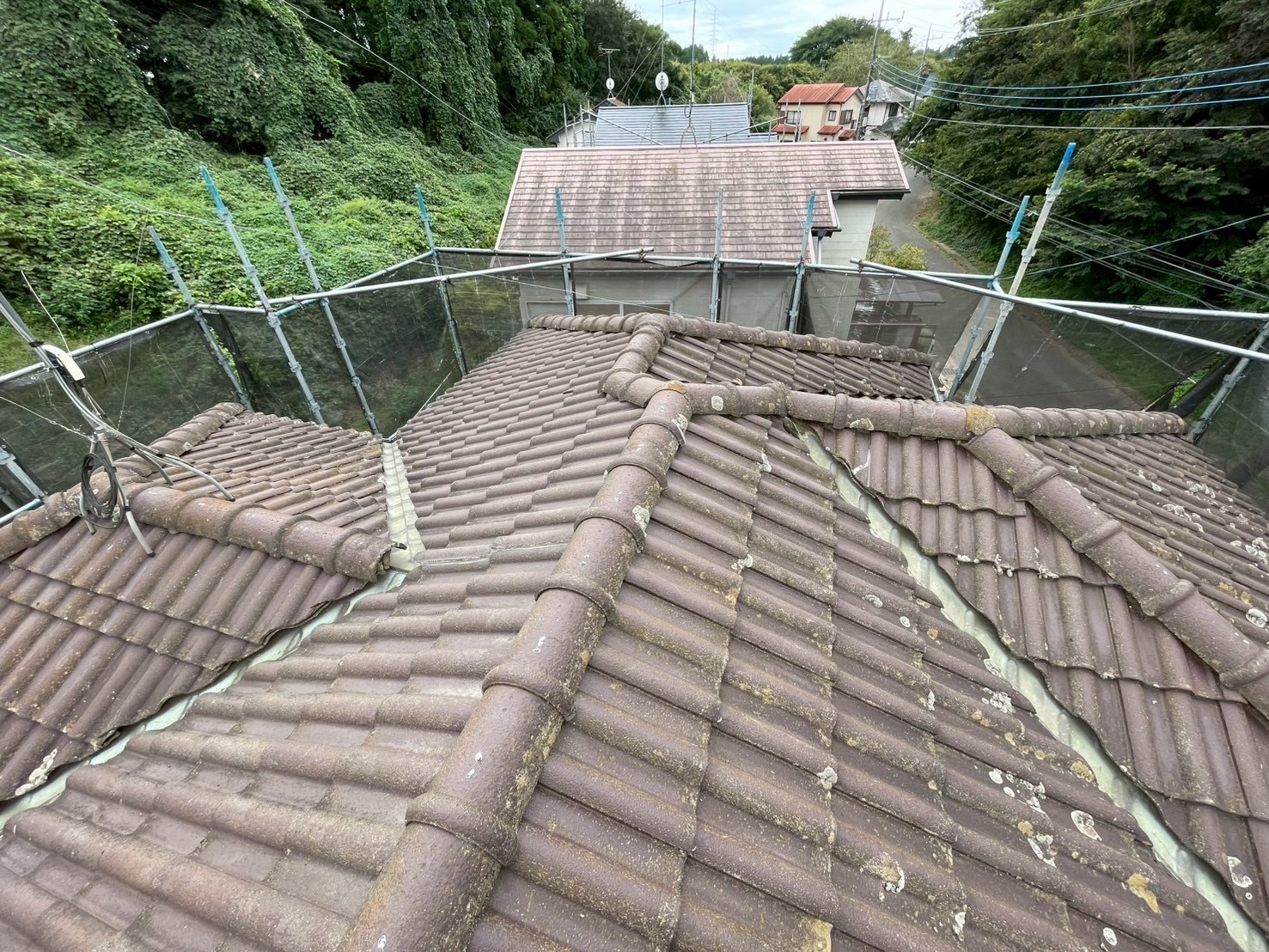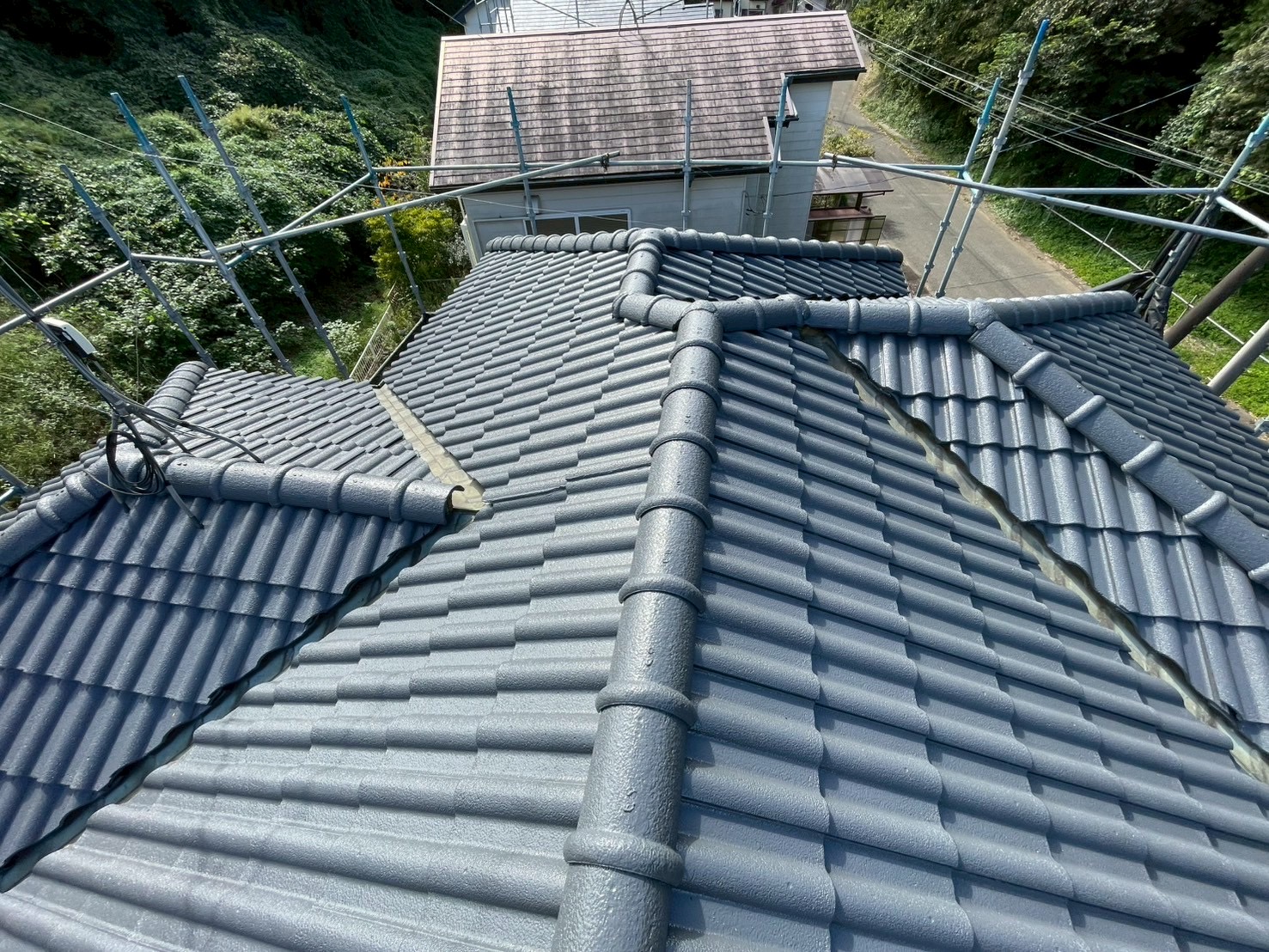 施工のポイント | 今回の屋根はセメント瓦で、吸水性が高く劣化が進みやすいため、まずは高圧洗浄でコケや汚れを徹底的に除去。 ラジカル制御塗料は紫外線による劣化を抑え、従来のシリコン塗料よりも耐候性・耐久性に優れた高性能塗料です。 ツヤと防水性を両立させることで、屋根の寿命をしっかり延ばすことができました。 |