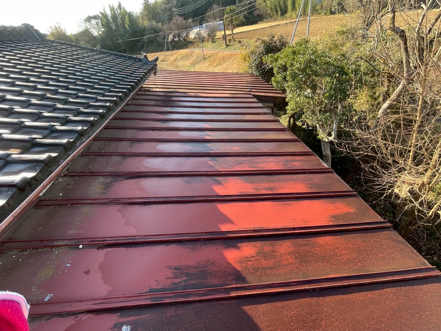 特にトタン屋根は、サビが進行すると腐食→穴あき→雨漏りへと発展する可能性があります。早めの塗装メンテナンスが重要な状態でした。