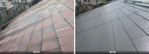 紫外線や雨風による経年劣化で、屋根全体の色が薄くなり、防水性が低下していました。 - 汚れやコケの付着