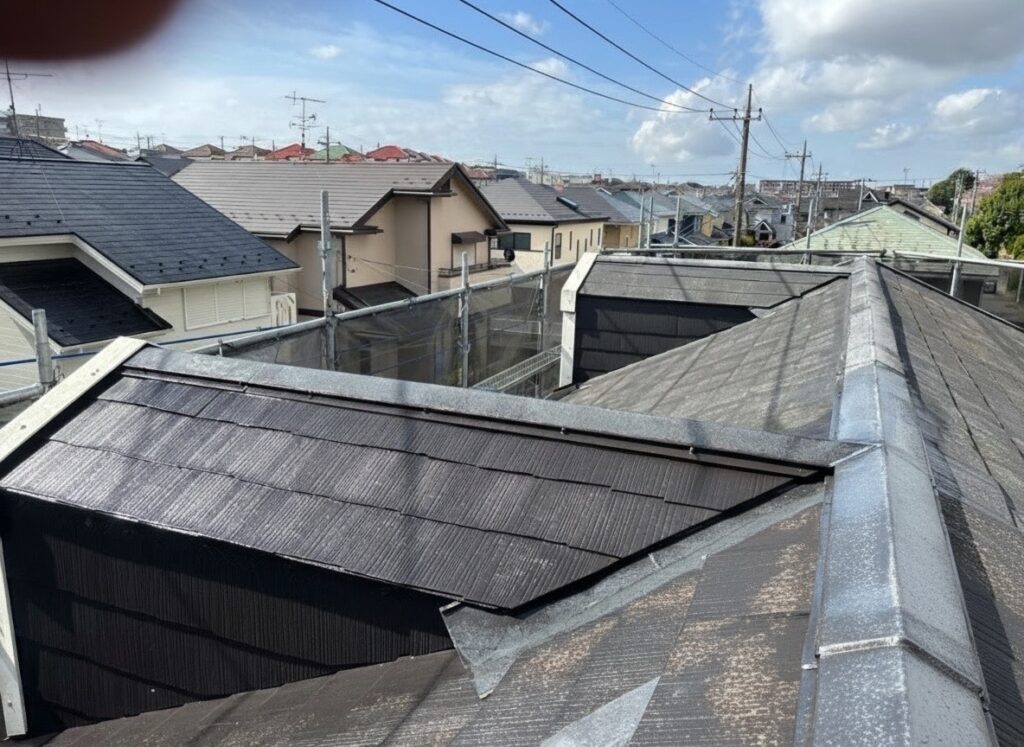 | 施工のポイント | 施工では、まず高圧洗浄で旧塗膜や汚れを徹底除去。 その後、下塗り → 中塗り → 上塗りの3工程を丁寧に施工しました。 また、棟板金の釘をビスに打ち替え、浮きやズレを防止する処理も実施。 塗装後は、深みのある艶と防水性能を兼ね備えた、安心の屋根へと生まれ変わりました。 |