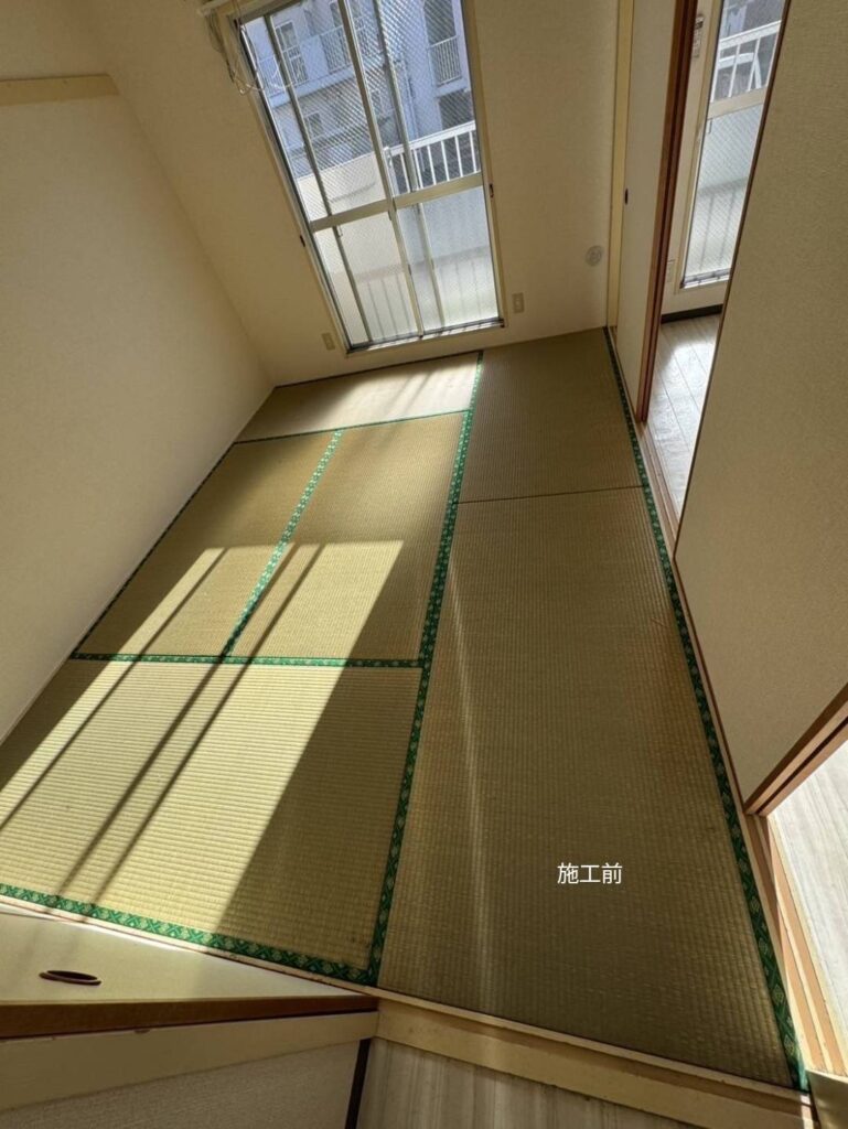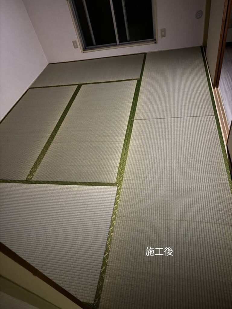 | 施工のポイント | ■ 畳のサイズに合わせた丁寧な施工 既存の寸法に合わせて、きれいに納めました。 ■ 畳縁(たたみべり)のデザイン調整 和室の雰囲気に合う縁で、落ち着いた仕上がりに。 ■ 賃貸物件の原状回復としての施工 入居募集にもつながる、清潔感ある和室へ改善しました。 |