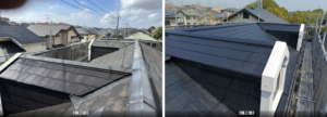 | 施工のポイント | 今回の屋根材はスレート(コロニアル)で、劣化が進行していたのと、排気ガスによる汚れの蓄積もあったため、高圧洗浄(スペースショット)で旧塗膜や汚れをしっかり除去した上で、下塗り → 中塗り → 上塗りの3工程を丁寧に施工しました。 さらに、塗膜の密着性を高めるためのケレン作業と、雨水の排水性を確保する縁切り作業も実施。美観と耐久性の両立を図った仕上がりとなりました。 |