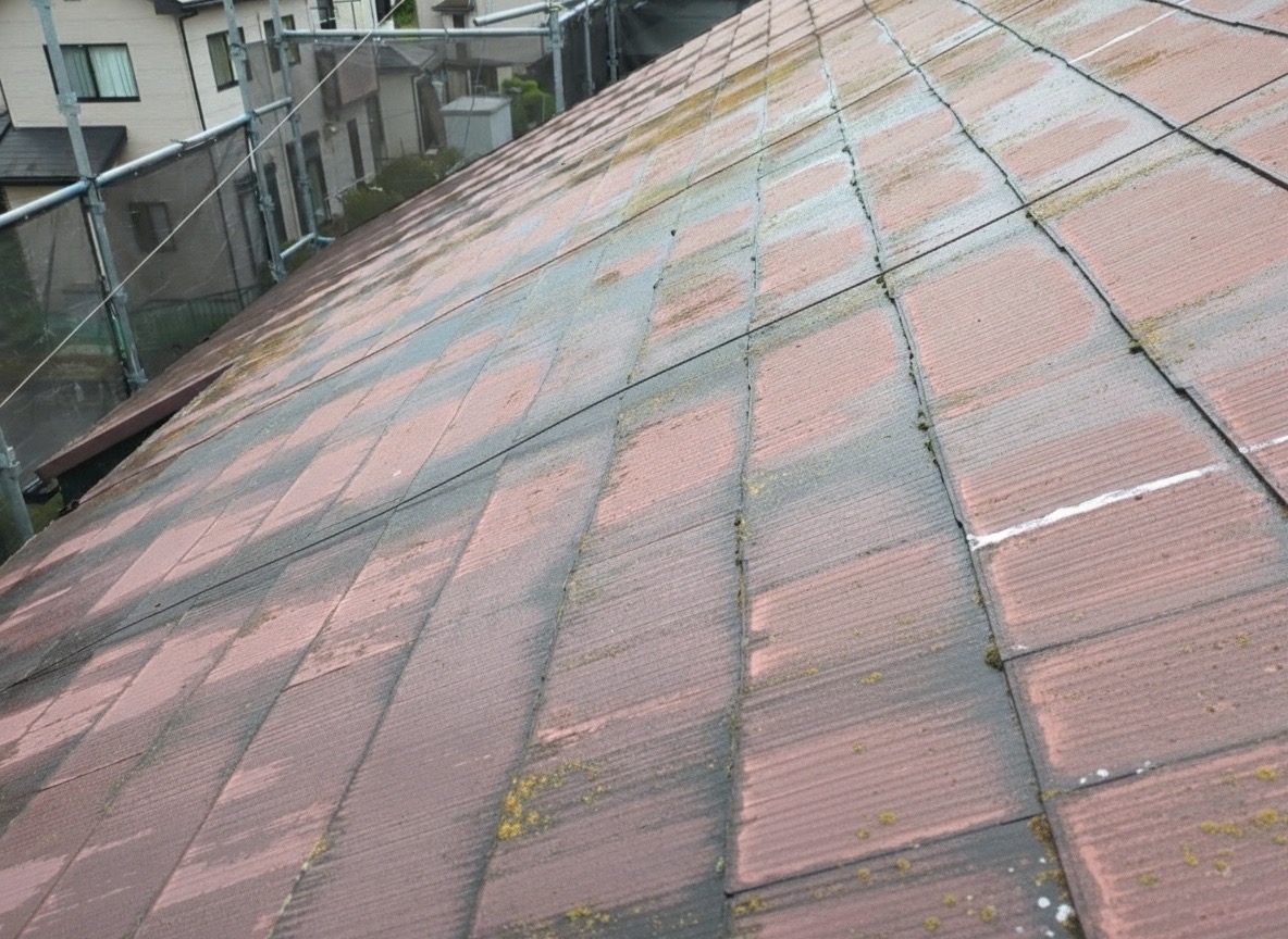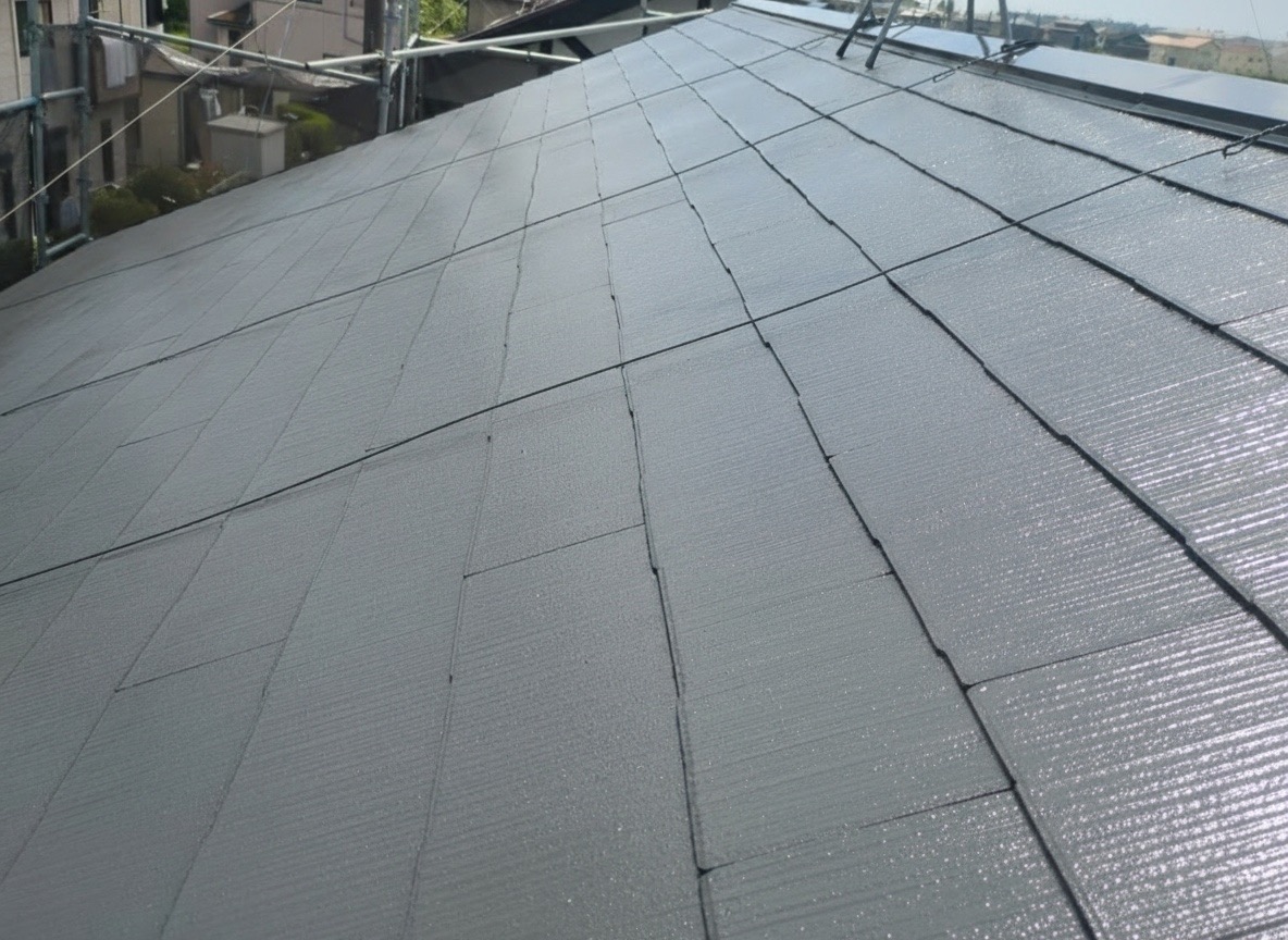 | 施工のポイント | 今回の屋根材はスレート(コロニアル)で、劣化が進行していたのと、排気ガスによる汚れの蓄積もあったため、高圧洗浄(スペースショット)で旧塗膜や汚れをしっかり除去した上で、下塗り → 中塗り → 上塗りの3工程を丁寧に施工しました。 さらに、塗膜の密着性を高めるためのケレン作業と、雨水の排水性を確保する縁切り作業も実施。美観と耐久性の両立を図った仕上がりとなりました。 |