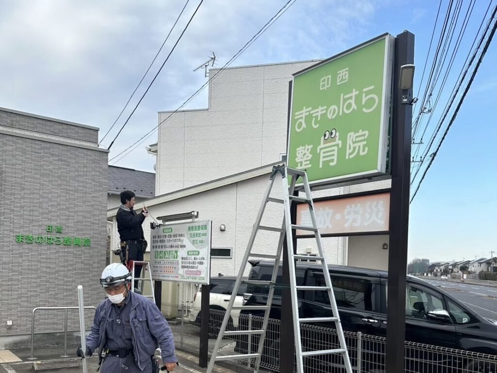 印西市内にある「印西まきのはら整骨院」様より、看板交換工事および外部照明交換工事のご依頼をいただきました